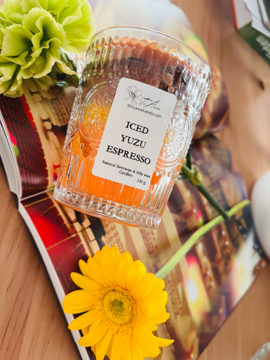 Is a bold zesty swist on a coffeehouse classic, the fragrance opens with a burst of bring Yuzu citrus and splash of lemon zest, At the heart fresshy brewed espresso and roasted coffee beans, the base lingers with vanilla cream and hint of iced sugar syrup, this drink perfect on Candles form !