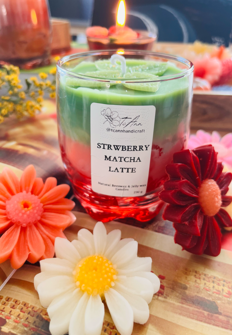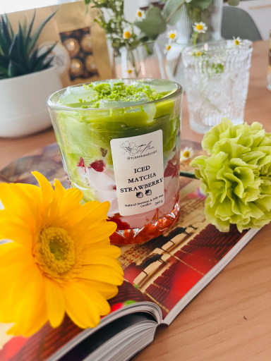 Blends the fresshness of ripe beeries with the soothing richness of green tea with juicy strawberry and a hint of wild raspberry, earthy matca green tea and frothy steamed milk created a creamy , comforting layer that softens the fruitness. Rrefreshing and cozy like sipping a strawberry topped latte on a sunny afternoon.
